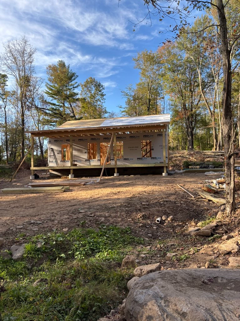 A full house-wrap was applied to protect the framing from the elements and prepare for siding. This wrap provides a moisture barrier while still allowing the building to “breathe.”