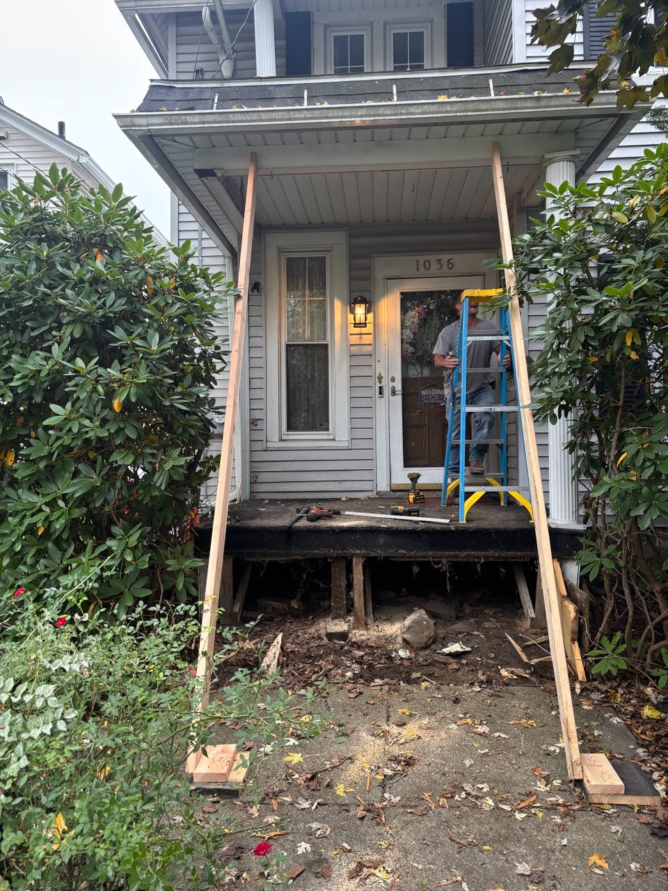 Our team began by carefully demolishing the existing porch, removing all damaged materials while protecting the home’s foundation and surrounding landscaping. Once the site was fully cleared, we reinforced the base and laid the groundwork for a brand-new design — stronger, more functional, and built to today’s construction standards.
